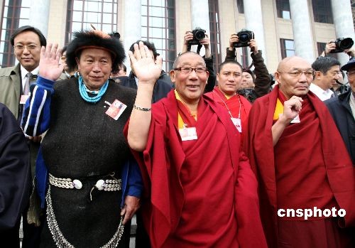 3月12日,全國政協十一屆二次會議閉幕。圖為來自西藏的宗教界委員阿旺吉卓(中)走出會場。中新社發 傅丹丹 攝