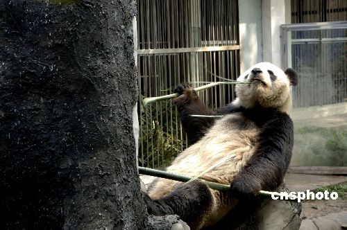 三月十二日,去年從四川地震災(zāi)區(qū)轉(zhuǎn)移到福州的大熊貓在福州熊貓世界里,躺在明媚陽光下,悠閑地吃著竹子。中新社發(fā) 王東明 攝