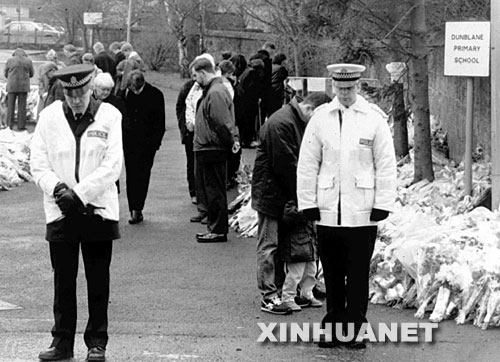 1996年3月,一名持槍男子闖入英國蘇格蘭鄧布蘭的一所小學,開槍打死16名小學生及他們的老師,隨后自殺身亡。這是1996年3月17日,一些蘇格蘭人垂手肅立,為鄧布蘭小學槍擊事件死難者默哀。