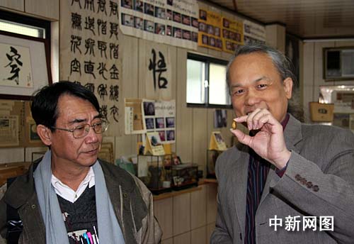 3月14日,由臺北縣政府文化局委托的專家組在“臺北縣博物館家族”之一的陳逢顯毫芒雕刻博物館內調研。圖為臺灣著名微雕家陳逢顯(右一)向專家組成員展示他以臺北故宮博物院所藏“多寶閣”果核微雕作品為范本,正在以橄欖核進行雕刻的作品。 作者:陳立宇