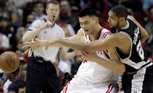3月15日早上進行的一場NBA常規賽中,昨天擊敗了山貓的火箭沒有能夠取得連勝。面對西南賽區的第一名圣安東尼奧馬刺,姚明拿到了18分11個籃板球,鄧肯拿到了15分12個籃板;鸺詈箨P頭連續錯失反超和扳平拖入加時的機會,最終以85比88遺憾的輸給了馬刺。