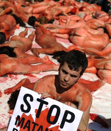 3月15日,西班牙馬德里,動物保護協會成員身涂人造血,抗議捕獵海豹。