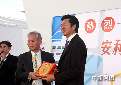 圖為臺灣海峽兩岸觀光旅游協會秘書長吳朝彥向安利大中華區行政總裁顏志榮致贈臺北縣新莊百年老店的傳統喜餅。