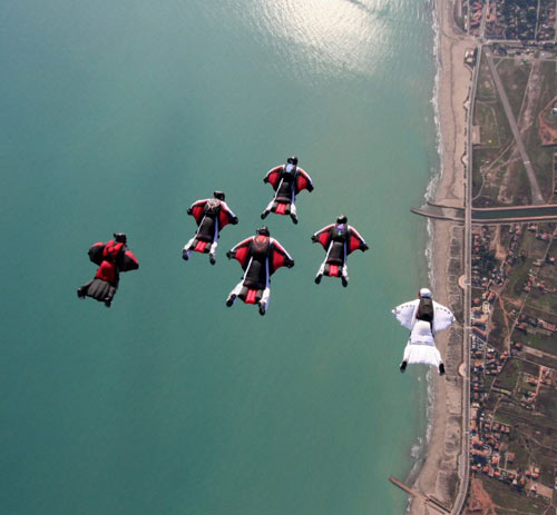 中新網(wǎng)3月21日電,據(jù)英國(guó)媒體報(bào)道,一幫飛行愛(ài)好者近日在德國(guó)進(jìn)行了精彩的翼服飛行編隊(duì)表演,他們從距地面近4000米的飛機(jī)上跳下,以193公里的時(shí)速滑行,彼此之間只有幾厘米的間隔。這些勇敢者只戴著頭盔,穿著價(jià)值1000英鎊的翼服,他們的腳踝處還綁著發(fā)煙罐。在空中,他們就像一群紅色的蝙蝠。不僅完成了完美的空中編隊(duì),還像飛機(jī)一樣在身后留下一串煙霧。在距地面914米時(shí),翼服飛行愛(ài)好者們打開(kāi)降落傘,降落至地面上。