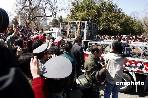 3月22日,在京生活了9個月的8只奧運大熊貓開始起程返回四川老家,北京動物園特地舉辦了“奧運熊貓返川儀式”,吸引萬名觀眾前來依依惜別。中新社發 鄭雄增 攝