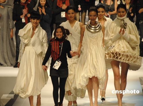 3月24日,中國國際時裝周(09/10秋冬季系列)在北京隆重開幕。來自18個國家的31位青年設計師在“漢帛獎”上的角逐,最終廣東青年設計師陳嘉慰的作品“點-線-面”獲得金獎。今年第17屆的“漢帛獎”大賽主題為“國慶招待會”。中新社發 樊建恩 攝