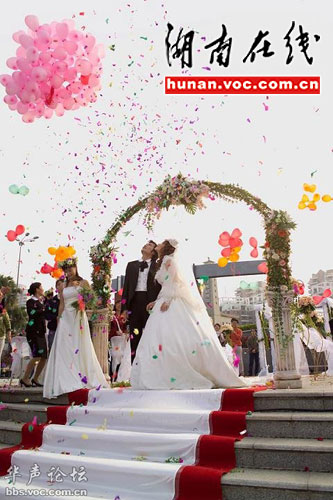 從帖子里貼的圖片來(lái)看,婚禮確實(shí)陣仗宏大,圖片中的場(chǎng)景大多為長(zhǎng)沙當(dāng)?shù)氐慕志埃玳L(zhǎng)沙湘江上標(biāo)志性的挪亞游輪等。但亦有細(xì)心網(wǎng)友提出疑問(wèn),場(chǎng)景中出現(xiàn)的新娘妝容及打扮均有不同,而且有一些照片甚至出現(xiàn)了數(shù)對(duì)新人,網(wǎng)友懷疑是集體婚禮。