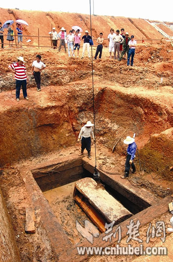 江夏區博物館館長劉治云告訴記者,經過連續的清理發掘,7日上午終于打開存放尸體的內棺。記者見到,內棺里全部充滿黃泥,考古人員小心翼翼用竹片一點點刮出淤泥,里面摻雜著不少黑色的渣滓和絮狀物,只是發現一塊玉石樣的物體,是墓主的下頜骨還是隨葬品有待考證。