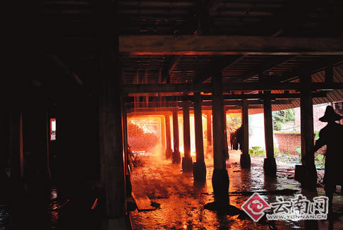 與此同時,發現房屋起火的村民也跑到村寨辦公室,用高音喇叭通知村民趕來救火。等玉溫接到兒媳電話趕回來時,大火已經燒得通紅,現場趕來的數十名村民已經開始用臉盆和水桶接水救火了。隨后趕來的公安民警、以及從遠處的曼春滿、曼聽等村寨趕來的村民也紛紛加入到了救火隊伍中。