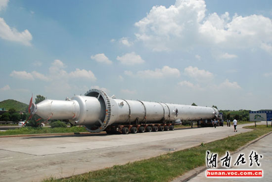 14日下午,一輛長大貨車,馱著161.58噸重的巨型“導彈”途徑京珠高速潭耒路段時,被耒陽高速交警查獲。經測量,該車總長54米,其中所載“導彈”長47米,相當于三節火車車皮那么長(單節火車車皮長18米),屬嚴重超限,且駕駛員無法提供有效的超限通行證件。