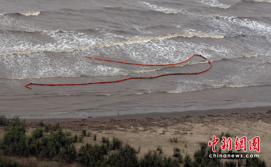 4月30日,在美國路易斯安那州海岸,為阻隔原油擴散而設的護欄帶被海風浪沖到岸邊。當天,美國總統奧巴馬下令調查墨西哥灣石油鉆井平臺爆炸事件,以避免將來類似事件再次發生。平臺爆炸沉沒后泄漏的原油當天已漂至美國沿岸。圖片來源:中國新聞網