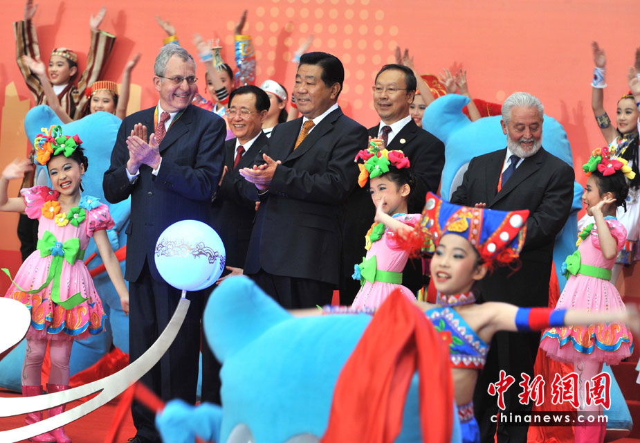 2010年上海世界博覽會開園儀式于5月1日上午舉行,全國政協主席賈慶林與國際展覽局主席藍峰共同啟動按紐。中新社發 賈國榮 攝
