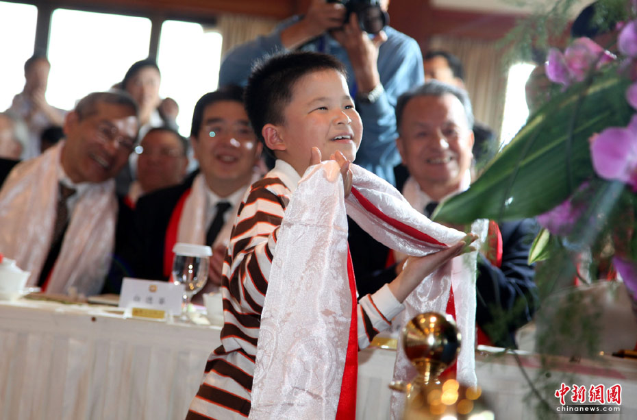 5月24日下午,“四川省感謝臺灣社會各界援助‘5.12’地震災區見面會”在臺北舉行,在汶川強震中勇敢救出2同學的小英雄林浩,向積極援助四川災區的臺灣同胞敬獻哈達。中新網記者 董會峰 攝