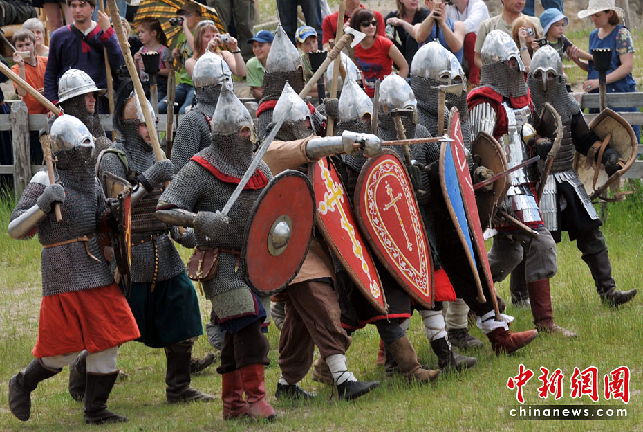 5月22日,在烏克蘭基輔郊區舉行的基輔羅斯節表演上,演出者再現了十三世紀的基輔羅斯戰役歷史場面。圖片來源:中國新聞網