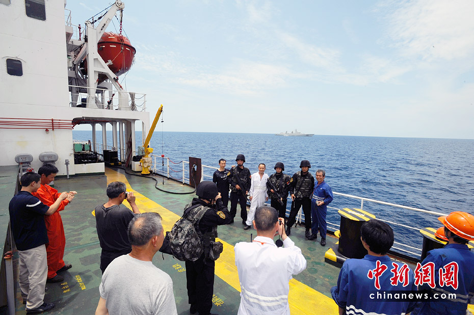 離別時,船員紛紛與特戰隊員以“廣州”艦為背景合影留念,以此表達對護航官兵的敬意和作為中國船員的自豪感。江山 攝