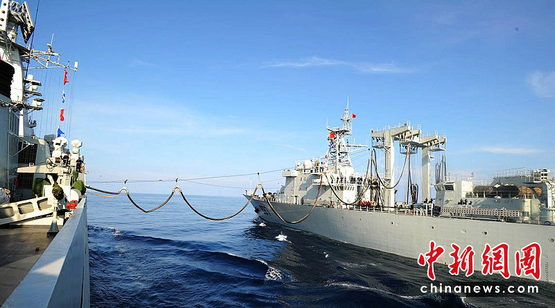 3月9日上午,第五批護航編隊在印度洋進行了首次海上補給!拔⑸胶本C合補給艦對“廣州”號導(dǎo)彈驅(qū)逐艦進行了橫向的液貨補給。江山 攝