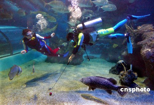 | 5月4日,由福州左海海底世界舉辦的“水上藍球賽、水下高爾夫”吸引了廣大市民前來參加,經過預賽后,進入決賽的五支隊伍進行進入水下高爾夫決賽。此次高爾夫比賽場地設置在水下5米左右的海底隧道里,長度約16米,時間30分鐘,誰在最短的時間內把球打進洞者勝出。由于海水浮力大、平衡性難以掌握,因此在如履太空的環境里他們時而站立打球,時而漂浮著推球,雖然難度較大,但他們都基本能順利地把球打進了洞里。海底世界為選手們提供了一個富有趣味性、參與性的活動,特別在水下高爾夫球賽中4與鯊魚、海龜零距離接觸,充分感受了海洋的美妙與神奇,體驗了人與自然的和諧。同時,通過開展活動,讓廣大市民進一步認識、了解海洋,了解海洋生物,從而促進自覺保護生物的意識,促進生態平衡,促進入與自然和諧發展。中新社發 祝敏松 攝