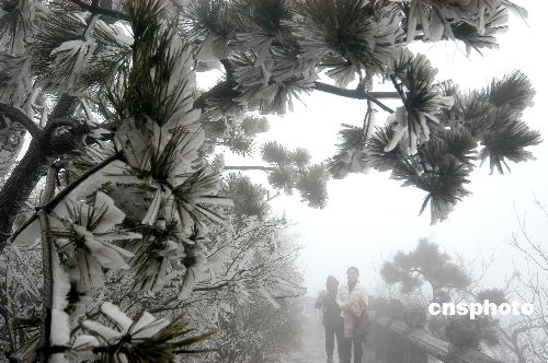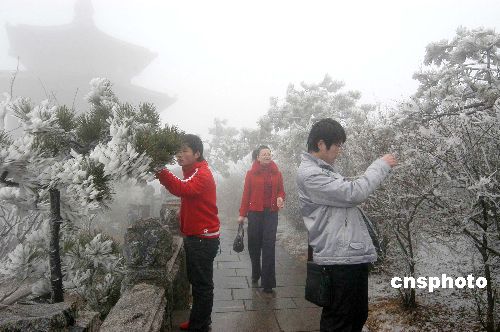 2月3日,江蘇連云港市花果山玉女峰迎來罕見的霧凇美景,滿山花木、樹梢凝霜掛雪,晶瑩剔透,吸引眾多游人前來領略難得一見的霧凇奇景。中新社發 王春 攝