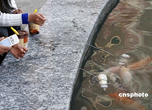 3月中旬,工作人員喂養“喝奶”的魚。在浙江東陽橫店影視城香港街景點內,養在水壇中的觀賞錦鯉是普通錦鯉與日本某錦鯉雜交后培育的品種,喂養它們則需要將飼料裝灌進嬰幼兒奶瓶中,該飼料的顏色如“乳奶”一般,然后將奶瓶用鐵絲系住放入水中,隨后,這些魚兒就會圍攏過來,爭搶著用奶嘴吸“奶”喝了。