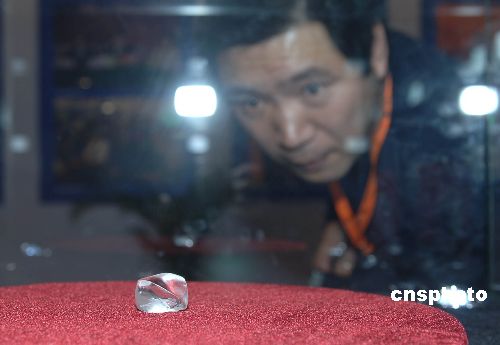 | 十一月八日,2006中國國際珠寶展在北京中國國際展覽中心開幕,世界各地五百家參展商參加了展覽。圖為中國材料工業科工集團展示今年五月二十七日發現的、重101.4695克拉特大金剛石(鉆石)樣品,吸引了眾多參觀者。101.4695克拉鉆石是在山東蒙陰縣“金伯力巖型”礦床上,勝利一號巖管礦石中產出,通過選礦車間手選工劉霞在手選大顆粒皮帶上撿到的。這是七零一礦在二十三年中,發現的第二粒特大金剛石。中新社發 鄒憲 攝