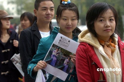 | 11月19日,參加面試“寶釵”、“黛玉”和“寶玉”角色的男、女孩竟排隊跟班。當天“紅樓夢中人”大型選秀湖北地區舉行面試。武漢室外溫度只有15℃左右,500余“紅樓夢中人”在瑟瑟寒風中踏上他們的圓夢之旅。從早8點多開始,就蜿蜒著由報名者和他們的親友團組成的長龍,參加面試時,更有不少親友團的成員也變成了選手。經過10小時的緊張角逐,110名選手拿到了參加鄭州賽區海選的通行證。 武漢選手的整體水準得到了河南電視臺導演組的認可,原定的80個過關名額最后突破到110人,其中最大的71歲,最小的才4歲。中新社發 胡偉鳴 攝