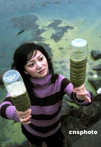| 在湖州太湖流域采集的藍(lán)藻水樣。往年夏季是太湖藍(lán)藻爆發(fā)季節(jié),10月至次年2月藍(lán)藻處于休眠期,但是今年,至現(xiàn)在太湖的藍(lán)藻還在持續(xù)爆發(fā),大量藍(lán)藻已逼近湖州市位于城西、城北的兩大自來水取水口,直接威脅城區(qū)數(shù)十萬市民飲水。該市自來水公司已經(jīng)啟動(dòng)緊急預(yù)案,目前尚未給飲水安全造成明顯影響。據(jù)了解,這次藍(lán)藻肆虐的直接原因是污染造成的水體富營養(yǎng)化,當(dāng)藍(lán)藻大量繁殖時(shí),水中的溶解氧濃度會(huì)迅速降低,造成魚蝦、螺螄等水生物的死亡,使水體遭受污染。從實(shí)驗(yàn)結(jié)果來看,藍(lán)藻對肝、脾都有一定的影響。中新社發(fā) 宋健浩 攝
