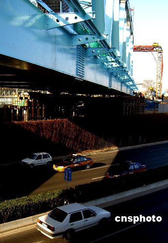 | 3月11日,據(jù)京津城軌工程指揮部消息,京津城軌重要配套工程跨北京南二環(huán)路鋼桁梁橋施工取得突破性進展,重達1400噸的藍色鋼橋成功跨過二環(huán)路。為了不中斷二環(huán)路交通,這座長96米的大型鋼橋由兩臺200噸馬力的千斤頂頂起整體跨越二環(huán)。京津城軌全長118公里,設計時速300公里,建成運營后,北京至天津半小時直達。其預計8月份完成橋梁架設,10月底開始鋪軌,2008年8月投入運營。該工程引進德國無砟軌道新技術,軌道板鋪設在路基上,再連接成整體道床,然后在上面鋪設鋼軌,能增加鐵道線路的穩(wěn)定性,降低行車噪音,適合快速列車通行。中新社發(fā) 楊可佳 攝