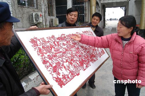 | 3月17日,民間剪紙藝人章玉梅在向人們介紹她的《逛陵朝祖》圖。當(dāng)日,河南太康縣農(nóng)村婦女章玉梅遠(yuǎn)赴淮陽,把她創(chuàng)作的一組描繪太昊陵二月廟會,反映人們朝祖進(jìn)香的《逛陵朝祖》圖剪紙作品無償捐獻(xiàn)給了朝祖會指揮部。該幅《逛陵朝祖》圖,寬0.7米,1.6米,裝表整齊。畫面上抬花轎,擔(dān)經(jīng)挑,舞龍、舞獅,劃旱船,賽龍舟等淮陽古老的民俗表演活動,淮陽特色的工藝品泥泥狗、布老虎也一應(yīng)懼全,正中間是一條鋪滿鮮花的彩虹大道,上面行駛著一輛輛私家小轎車,象征著生活如鮮花一般甜美。作品簡潔明了,清麗,用刀講究、細(xì)膩,宮殿、人物、動物造型栩栩如生、活靈活現(xiàn)。中新社發(fā) 楊正華 攝