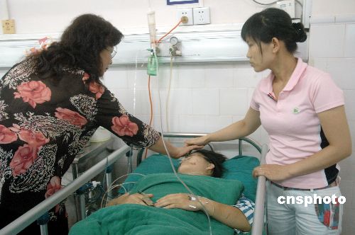 | 2007年5月15日下午,海口婦聯主席詹素華(左)在醫院重癥監護病房看望吳春花。21歲的吳春花是海南省華僑商業學校藥劑專業學生,今年將畢業。5月11日晚,她到海口市一家職介所應聘,“老板”李某欲對其施暴,危急關頭她從13樓窗口跳下,跌落在3樓泡沫塑料的頂棚上,當場摔成重傷,脊椎骨摔斷,腳部肌腱多處斷裂。連日來,海口社會各界紛紛向她捐款獻愛心。目前,吳春花已做了手術,傷情趨向穩定,但尚未完全脫離危險。涉嫌強奸的李某已被警方刑事拘留,此案在審理中。中新社發 善平 攝