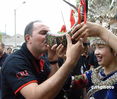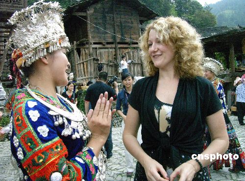 | 6月3日,一名俄羅斯記者在貴州雷山郎德苗寨與苗族姑娘交談。當日,來自俄羅斯12家主流媒體及新華社、人民日報、中央人民廣播電臺、中國國際廣播電臺4家中央媒體的記者團在黔東南苗鄉侗寨對貴州民族文化進行系列采訪。新聞背景:據悉,這次中俄記者團是經中俄“國家年”中方組委會批準,由國務院新聞辦和國家廣電總局主辦、中國國際廣播電臺和俄通社、塔斯社承辦的“中國年”活動項目“中俄友誼之旅·中國行”大型記者團跨境采訪活動,中外記者團走進貴州將利于對當地民族風情進行推廣。中新社發 吳東俊 攝