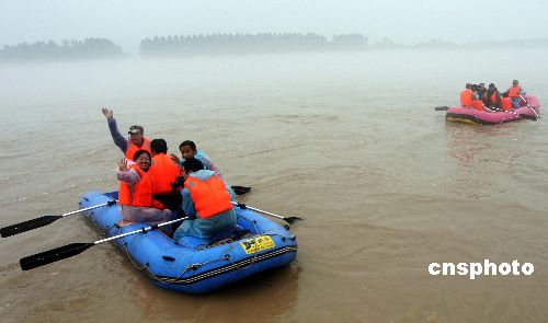 | 6月19日,在黃河西霞院水庫出水口下方,包括7位老“黃漂”隊員在內的16人隊伍,乘坐橡皮艇進入黃河漂流,紀念“黃漂”20周年。20年前,來自河南洛陽、北京、安徽馬鞍山的熱血青年以七個鮮活生命的代價首漂黃河成功,漂流全程5464公里、落差4831米,是我國江河漂流史上的壯舉。今天,原“黃漂”隊員選擇從洛陽到開封的河段再漂黃河,紀念黃河漂流20周年和死去的隊友。整個漂流過程約需要3天。7月初,他們還計劃從源頭出發,并在重點河段再度漂流。中新社發 張曉理 攝