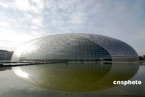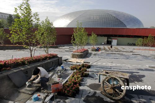 | 7月1日清晨,經過一天一夜降雨的洗滌北京終于露出了罕見的藍天白云,位于北京天安門廣場西側、由法國著名設計師保羅·安德魯(Paul Andreu)設計的中國“國家大劇院”主體工程已經完工,獨特的觀眾水下入場通道亮出雛形,幾名來自山東省的工人正在安裝花壇護欄。國家大劇院總投資人民幣268838萬元,2001年12月13日開工,2006年底基本建成,2007年中旬正式對外演出。中新社發 任晨鳴 攝
