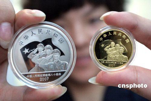 | 2007年7月31日,工作人員展示上市的“中國人民解放軍建軍80周年金銀紀念幣”。當日,中國人民解放軍建軍80周年金銀紀念幣在鄭州上市。該套紀念幣共2枚,其中包括1/2盎司圓形金質紀念幣1枚,最大發行量10000枚;1盎司圓形銀質紀念幣1枚,最大發行量30000枚,均為中華人民共和國法定貨幣,紀念幣正面圖案均為中國人民解放軍軍旗與陸海空三軍人物形象造型,并刊有國名、年號及“中國人民解放軍建軍八十周年”中文字樣。 中新社發 陳代述 攝