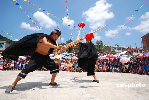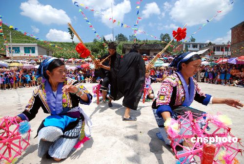 | 2007年8月6日,貴陽市開陽縣高寨苗族布依族鄉(xiāng)光中村舉辦苗族蘆笙節(jié)。豐富多彩的苗族民俗活動,包括蘆笙舞、跳園舞、唱山歌、吹木葉、姊妹簫、斗鳥和其它民俗節(jié)目。高寨光中的苗族系川滇黔方言、洛泊河次方言的小花苗,這是一支獨具魅力的能歌善舞的苗族支系。在光中附近,有神秘天書畫馬崖和苗族懸棺葬等多處歷史文物。 中新社發(fā) pengnian 攝