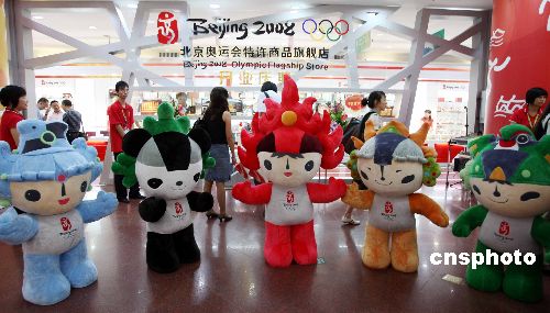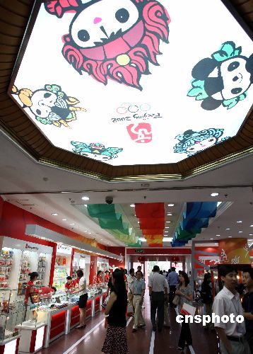 | 八月七日,北京奧運會特許商品旗艦店在素有北京金街之稱的王府井步行街工藝美術大廈隆重開業。北京奧組委執行副主席李炳華、國際奧委會市場開發委員會主席海博格出席旗艦店開業慶典儀式。該店營業面積六百五十平方米,經營特許商品品種超過四千款,是目前國內開設特許商品零售店中面積最大、品種最全的奧運特許商品零售店。截止目前為止,北京奧運會特許生產企業已發展到六十四家,特許零售商六十七家,開發特許商品近五千款。中新社發 任海霞 攝