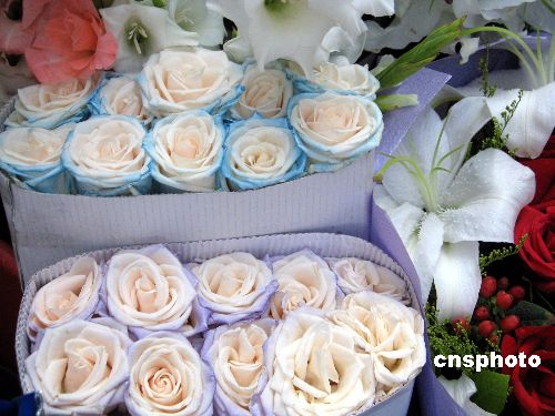 | 8月18日,北京一花卉市場,除了紅玫瑰、百合這類傳統“情人花卉”外,一種雪染玫瑰(簡稱雪玫瑰)成七夕情侶花卉的熱門貨。雪玫瑰分為白雪、藍雪、紫雪、綠雪等幾種,均由白玫瑰經一種進口染色技術染制而成,因其花卉上有雪花的圖案效果,雪融融地看上去非常漂亮。這種染花技術實際上和“藍色妖姬”的技術很類似,因其選用白玫瑰,基本不破壞本身的顏色和花感,看上去比“藍色妖姬”要清純得多。據商戶介紹,這種雪染玫瑰系列今年特別熱銷,情侶都喜以其作為節日禮物。中新社發 李巖 攝
