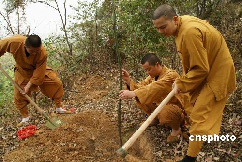 3月12日中國(guó)植樹(shù)節(jié),廣東南海西樵山寶峰寺的僧侶在西樵山國(guó)家森林公園參加植樹(shù)造林。有珠江西岸文明燈塔之稱的廣東南海西樵山國(guó)家森林公園,經(jīng)過(guò)多年植樹(shù)造林,森林覆蓋率已達(dá)到90%以上。中新社發(fā) 孫建駒 攝