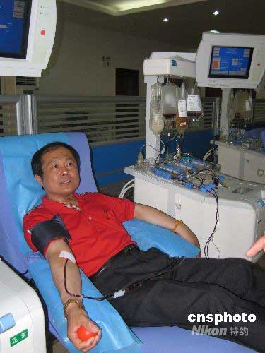 6月14日,堅持30年,義務鮮血超過2萬CC的天津康農食品有限公司董事長林易陞走進天津市血液中心,以捐獻成分血的實際行動,詮釋今年世界獻血者日主題:定期獻血。中新社發 田齊 攝