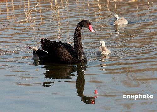 12月14日,北京圓明園,一對黑天鵝夫婦帶著8只未滿月的天鵝寶寶在享受著北京冬日溫暖的陽光。據介紹,8只小黑天鵝是11月22日出生。中新社發 鄭雄增 攝