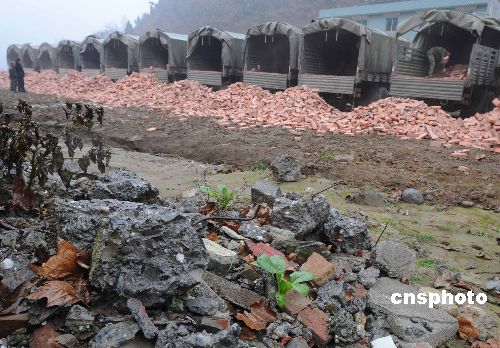 2009年元旦節,解放軍成都軍區重返地震災區的運輸部隊冒著余震小雨,從重慶為重災區北川縣曲山鎮災民無償運來重建家園急需的紅磚。中新社發 賈國榮 攝
