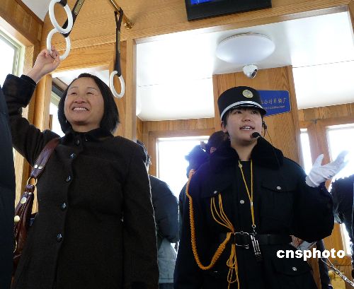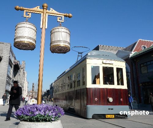 2009年1月1日,北京前門兩輛“鐺鐺車”舉行了開通剪彩儀式后,于上午11點正式載客運行,京城市民及各地游客紛紛乘坐“鐺鐺車”感受老北京的風情。時隔50年后那“鐺鐺”的聲音再次回到了煥然一新的前門大街。 中新社發 玉龍 攝