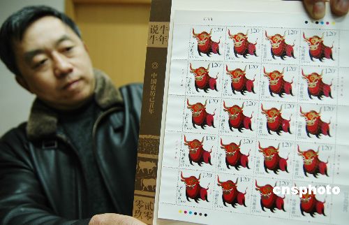 2009年1月4日,即將發行的《己丑年》特種郵票運抵蘇州。據悉,國家郵政局和中國郵政集團公司將于1月5日在蘇州首發該套以“奔!睘樾蜗蟮摹都撼竽辍诽胤N郵票。該次發行的《己丑年》郵票一套一枚,面值1.2元。郵票圖案為健壯倔強的奔牛形象,表現出奮力向前的視覺效果,寓意人們對生肖牛年的期望與寄托。中新社發 朱子寒 攝