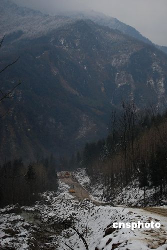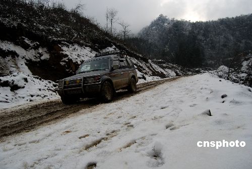 1月5日,新年伊始,四川北川迎來了2009年到第一場雪,由于大雪封山,擂禹路海拔1500米的冒火山已被冰雪吞沒,維系北川關內12個羌族、藏族鄉(xiāng)鎮(zhèn),6萬多名群眾生產生活的“生命線”再次因風雪阻斷。目前,北川交通護路隊進入擂禹路開始搶通,預計10日能夠搶通。中新社發(fā) 胥輝 攝