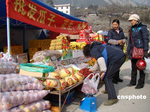 1月21日,四川汶川特大地震震中映秀鎮(zhèn)板房區(qū)的集市熱鬧非凡,春節(jié)將近,受災(zāi)民眾正忙著采購食品和年貨。中新社發(fā) 霍潺 攝