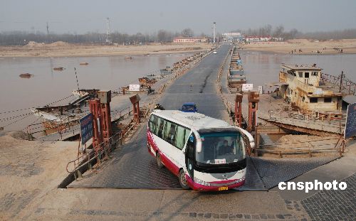 2009年1月29日,車輛從剛恢復(fù)通車的濼口浮橋上通過。由于近期氣溫回升,黃河濟(jì)南段流凌密度降至10%以下,截至上午8時(shí),濼口段流量保持在248立方米/秒以下,持續(xù)一個(gè)多月的凌汛已經(jīng)大幅度緩解。據(jù)濟(jì)南黃河防汛辦公室專家稱,近期黃河下游不會(huì)形成嚴(yán)重凌汛。濼口浮橋下游的章丘、歷程、濟(jì)陽(yáng)有10段封河,封河長(zhǎng)度在25公里左右。中新社發(fā) 滕越 攝
