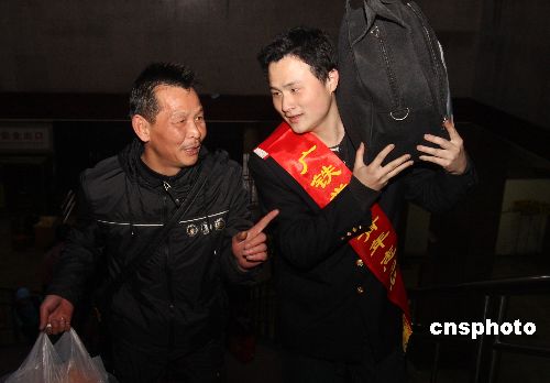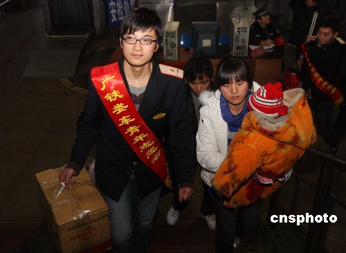 1月29日,湖南省婁底車務段的青年志愿者在婁底火車站為攜帶許多行李等老弱病殘等旅客提供各種幫助。當日,湖南省婁底火車站迎來節后返程客流小高峰,婁底車務段團委組織近千名團員青年志愿者開展“和諧春運”活動,在管區內的車站設立了被旅客稱為“愛心島”的青年志愿者服務站,為旅客提供溫馨服務。中新社發 郭國權 攝