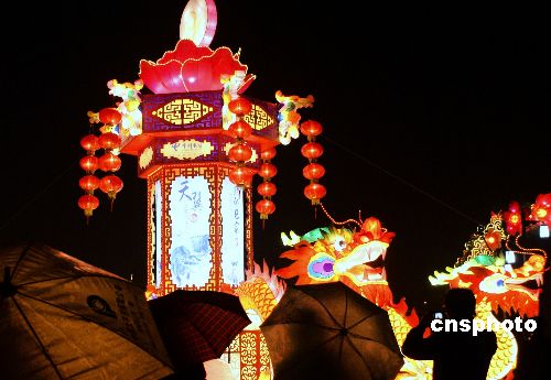 2009年2月2日晚,江蘇省鹽城市在剛落成不久的鹽鎮風情文化水街開始舉辦首屆新春燈會,主題為“盛世中華和諧鹽城”。用“龍騰盛世”、“鶴鹿同春”等一組組流光溢彩的燈飾造型著力展現“東方濕地之都,仙鶴神鹿故鄉”的獨特風采。雖然有連綿的陰雨,市民賞燈的激情卻絲毫沒有削減,一個個打傘賞燈的身影游動在絢麗繽紛燈海中,使燈火點綴的仿古景區更添幾分情趣。中新社發 李根 攝