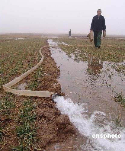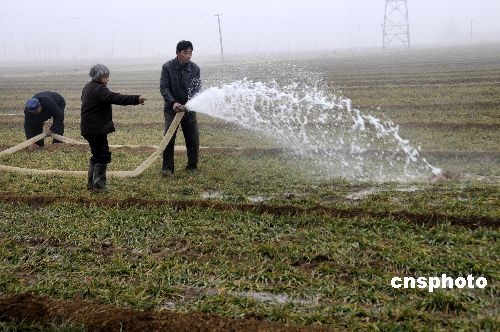 2月5日,山東省臨沂市沂南縣蘇村鎮(zhèn)農(nóng)民在用噴灌澆麥。今年臨沂市小麥?zhǔn)芎得娣e達(dá)到390萬畝,其中重旱面積達(dá)210萬畝。臨沂市因地制宜,推廣“長(zhǎng)龍”節(jié)水灌溉技術(shù)。“長(zhǎng)龍”是一種塑料軟管,灌溉澆水時(shí)接在水泵上,通過這種軟管導(dǎo)水入田,并視灌溉情況可隨時(shí)移動(dòng)。中新社發(fā) 杜昱葆 攝