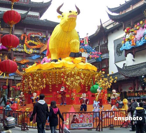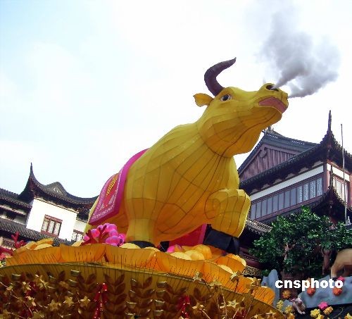 2009年2月6日,一個長7米、高3米的巨型“牛燈”在上海豫園元宵燈會上閃亮登場!芭簟钡谋强走會冒煙,以應和“牛氣沖天”的寓意。中新社發 井韋 攝