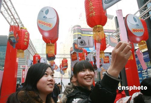 2月8日,人們在北京中關村競猜謎語。為迎接元宵佳節,北京中關村舉行元宵燈謎會,用“電腦”、“相機”、“鼠標”、“手機”等造型懸掛的燈謎,吸引了不少市民駐足猜謎。中新社發 陳曉根 攝